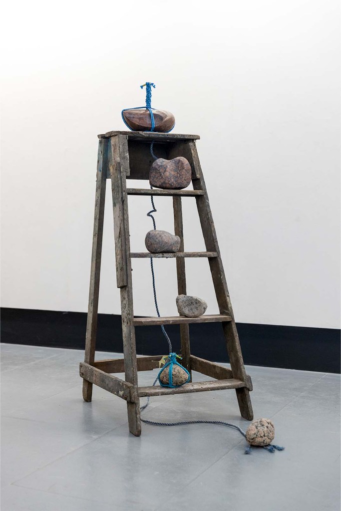 I start to stroll around the artworks, notebook in hand – pen poised. The more I look, and immerse myself in the exhibition, the more I realise that the initial spiritual-feeling of the space, is actually pricked by a strange, dark, cheekiness. In the far-right corner sits Sean Alec Auld’s sculpture, The Great Mime. This piece is made up of an old wooden step ladder and an arrangement of cascading stones. Some of these stones are carefully encased in blue knotted rope. On one side of the ladder, the words ‘f*ck you’ have been scrawled in yellow. They’re barely intelligible, but they’re there. Revealing themselves cheekily to the observant eye. The industrial blue rope around some of the stones also reminds me of shibari – a Japanese style of bondage. I also get this vibe from Sean’s installation at the front of the space, where a huge tooth shaped mound of granite is intricately knotted in the same blue rope, hanging in the air. Suspended from this taught rope, anchored to the ground by heavy, interlocking stone ~ I can’t help but interpret a quiet kinky quality from this piece. Whether this was the artists’ intention or not, I’m not sure. What’s clear is that there’s a subtle cheekiness imbedded within Alec’s work.