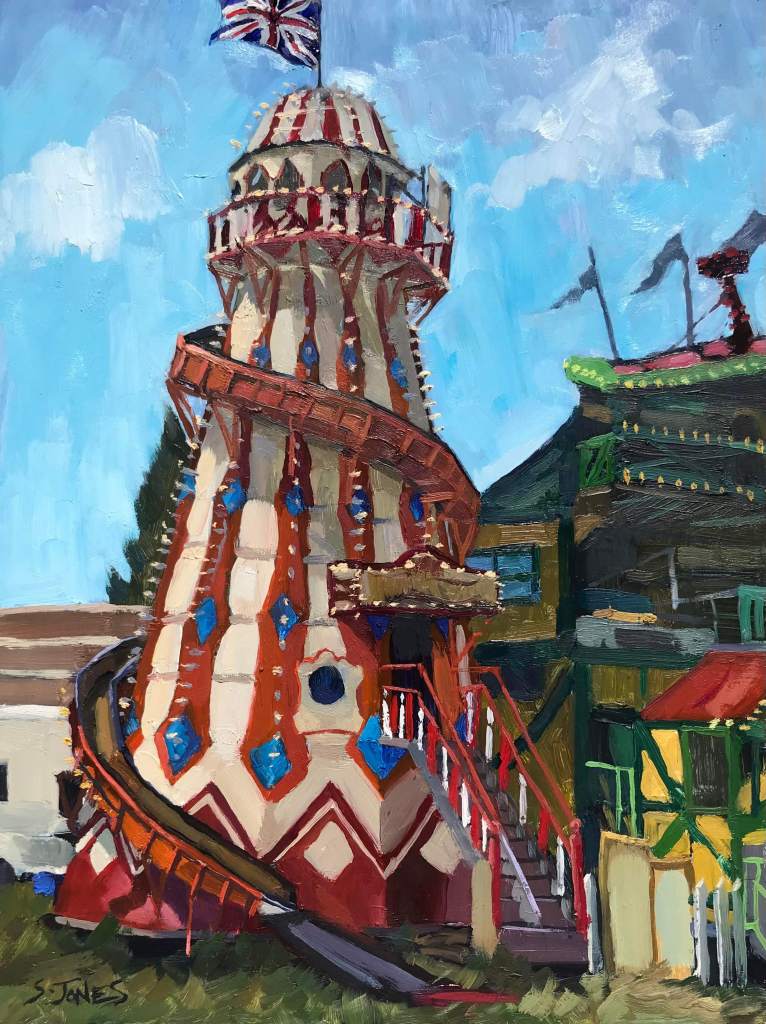 Stuart Jones, Giant Helter Skelter, The Hoppings, Oil on gesso Board