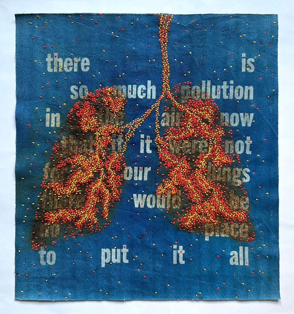 Rhiannon Robinson, The Evolution of Flowers & Lungs, Hand embroidery over cyanotype print on cotton fabric
