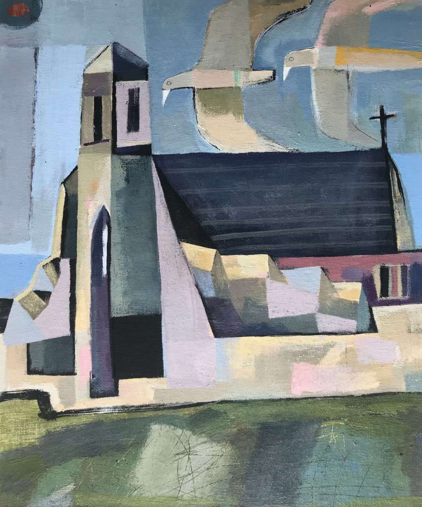 Michael St. Clair, Two Birds Flying Close to a Church, Acrylic on board